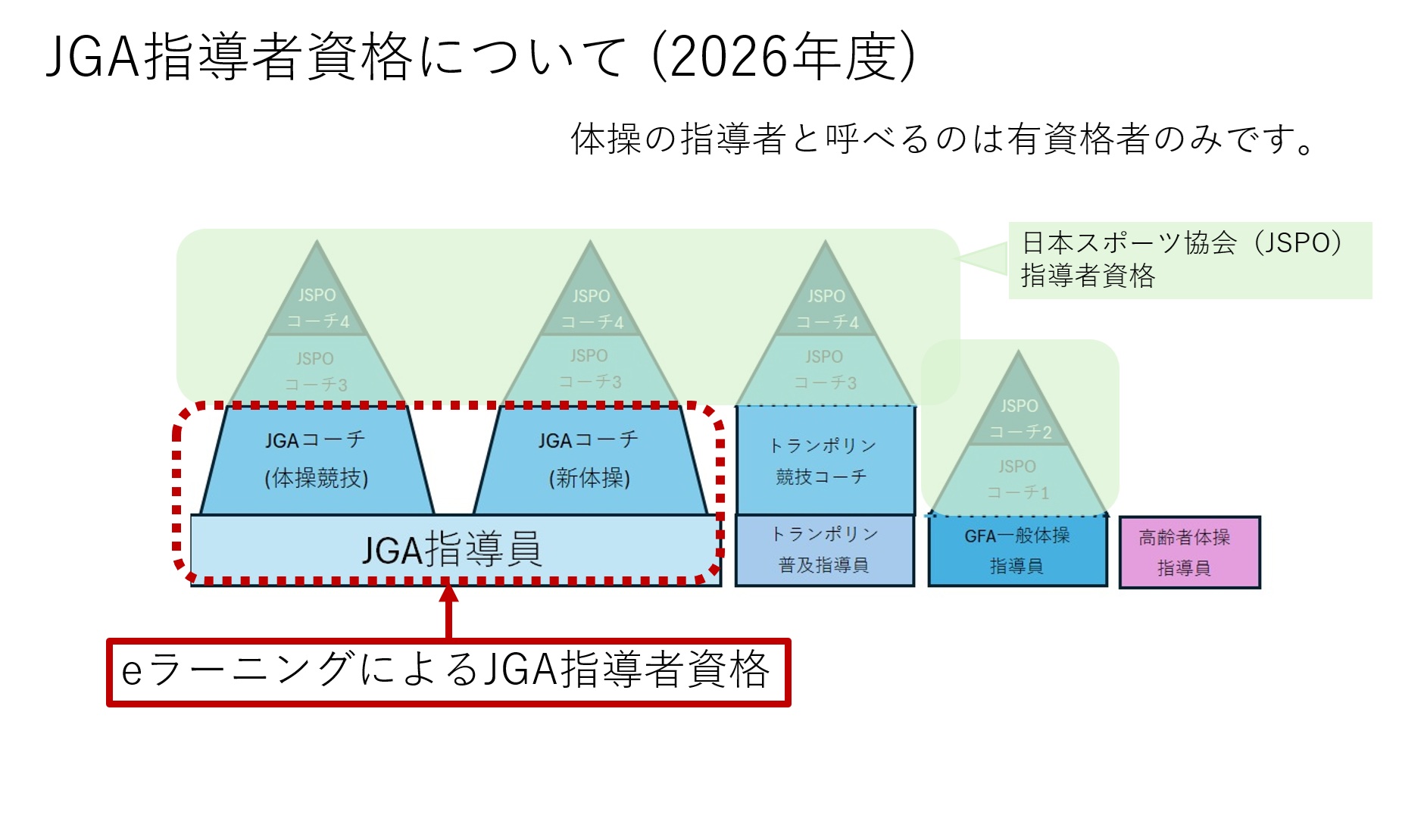 競技体操を経験していない方でも「体操(身体をコントロールする)」を指導するファーストステップとして「JGA指導員」資格を新設しております。大会に参加しない体操教室・部活動・地域スポーツ少年団・愛好者などの指導者を対象とした位置づけの資格となっております。JGAコーチ(体操競技/新体操)